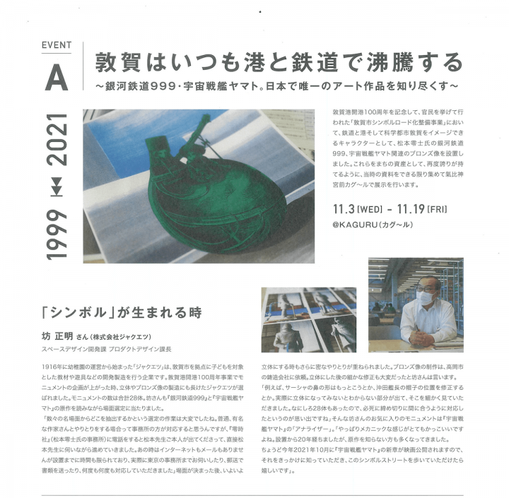 福井県敦賀市の情報誌「国8空活(コクハチクウガツ)」にて、弊社が敦賀市シンボルロードに「銀河鉄道999」と「宇宙戦艦ヤマト」のモニュメントを製作した際のエピソードが掲載されました.